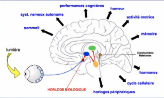 Ce rythme biologique se comporte comme le chef d’orchestre de notre corps. Par exemple: il ordonne la sécrétion d’insuline, hormone intervenant dans le cycle du glucose, lorsqu’il est l’heure de manger, la sérotonine, neurotransmetteur sécrété lorsqu’il fait jour, ou des hormones nocturnes comme la mélatonine, ou l’hormone du sommeil, pour s’endormir, l’adénosine et les orexines, (qui influence l’appétit et l’état d’éveil, l’adénosine, joue un rôle important dans le métabolisme... Cette horloge une fois fixé est difficilement modifiable.